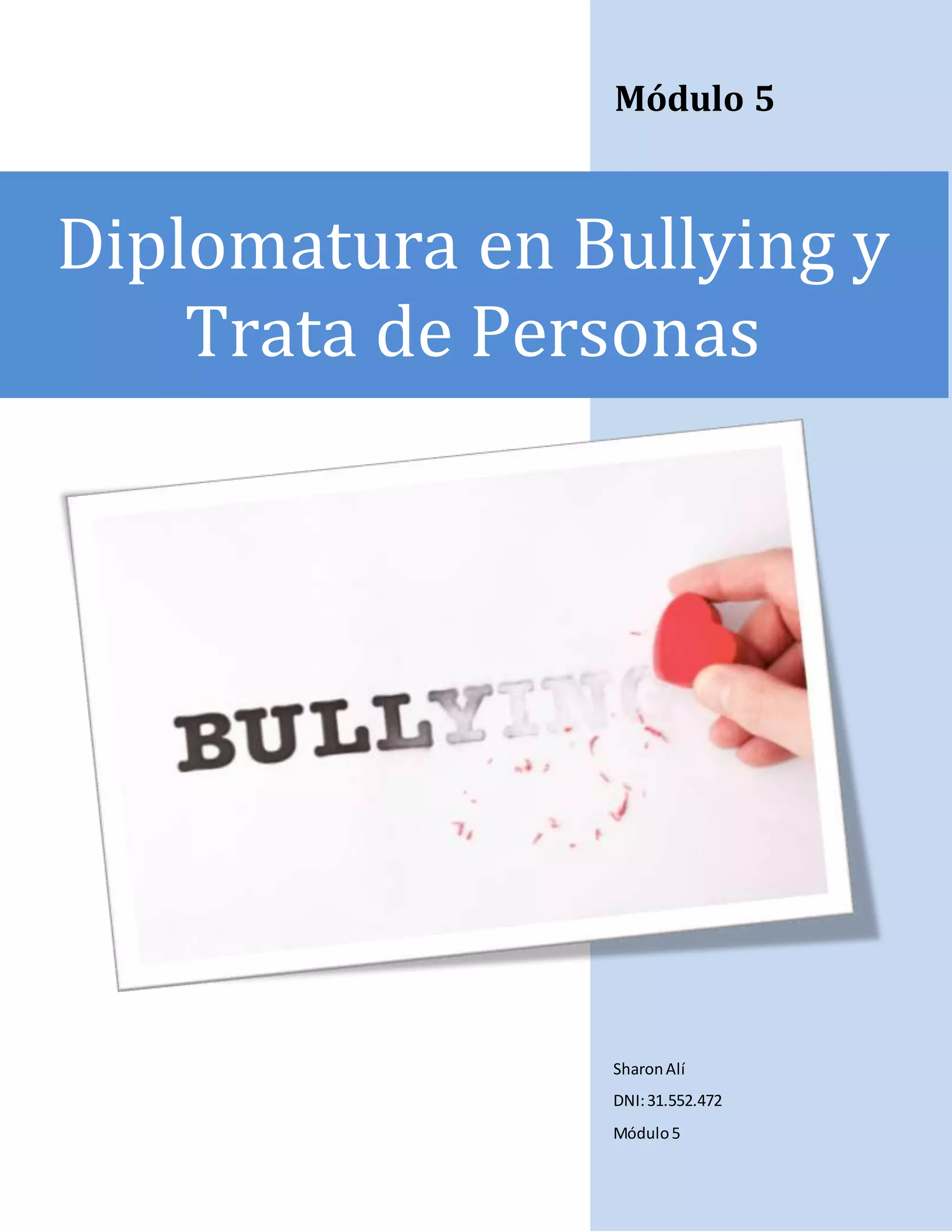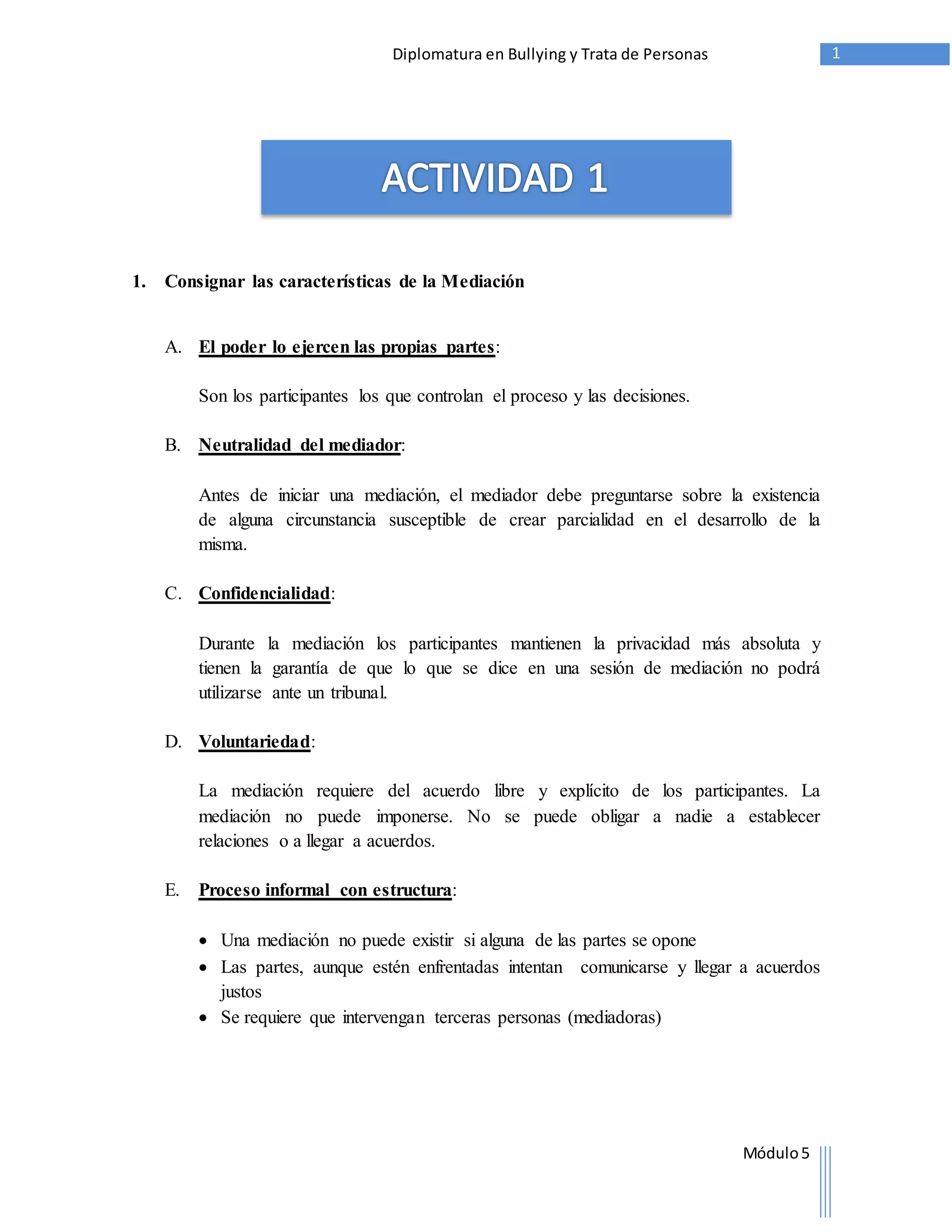 Este documento presenta información sobre el Módulo 5 de una Diplomatura en Bullying y Trata de Personas. Se define la mediación y se describen las características, el rol del mediador y las etapas del proceso de mediación. También se conceptualizan diferentes herramientas y técnicas de mediación, como la mediación escolar. Por último, se presenta un caso de mediación escolar entre una alumna y una profesora para ser analizado.