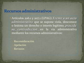 El documento resume los principales aspectos relacionados con los recursos administrativos en materia de contrataciones públicas en Perú. Explica los tipos de actos que pueden ser impugnados, los requisitos para interponer recursos, los plazos aplicables, el procedimiento ante la entidad y el tribunal, y las posibles resoluciones. Asimismo, detalla aspectos como la estructura de los recursos, los análisis de admisibilidad y procedibilidad, y las consecuencias de las diferentes resoluciones.