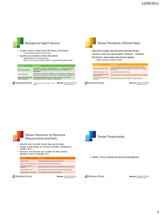 Este documento describe los nuevos servicios de background disponibles en Windows Phone como Background Agents, Background Notifications y Background Transfers. Los Background Agents permiten ejecutar código en segundo plano a través de tareas periódicas o tareas intensivas en recursos, sujetas a limitaciones como la duración, uso de memoria y requisitos de alimentación y conectividad.