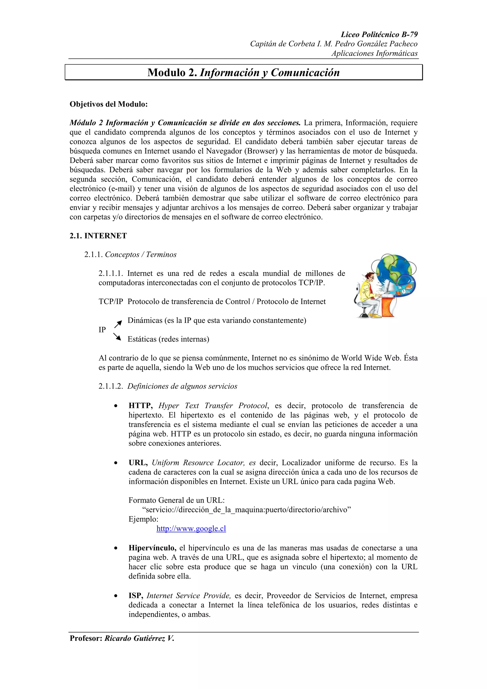 El documento presenta los objetivos del Módulo 2 de Información y Comunicación. Explica conceptos clave de Internet como protocolos TCP/IP, direcciones web, navegadores, motores de búsqueda, cookies y caché. También cubre aspectos de seguridad como certificados digitales, encriptación, virus informáticos y firewalls.