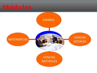El documento presenta los objetivos de aprendizaje de varios módulos educativos en español, ciencias sociales, ciencias naturales y matemáticas. En español, los estudiantes aprenderán sobre el lenguaje oral y escrito, la solución de problemas verbales y las características de los géneros literarios. En ciencias sociales, se enfocarán en problemas contemporáneos, la geografía de México y eventos históricos. El módulo de ciencias naturales cubrirá conceptos de ecología, contaminación, sal