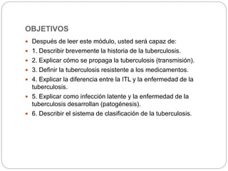 1) La tuberculosis ha afectado a la humanidad por siglos y fue identificada como una enfermedad contagiosa en el siglo XIX. 2) Se transmite a través del aire cuando personas con tuberculosis tosen o estornudan, expulsando gotitas que contienen la bacteria. 3) El desarrollo de antibióticos en la década de 1940 redujo dramáticamente las tasas de mortalidad, pero los casos han vuelto a aumentar debido a factores como la resistencia a los medicamentos.