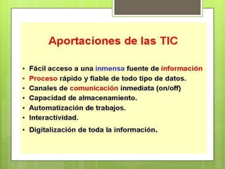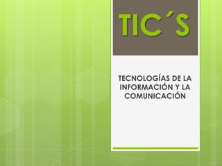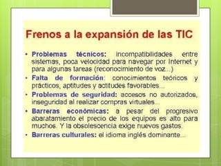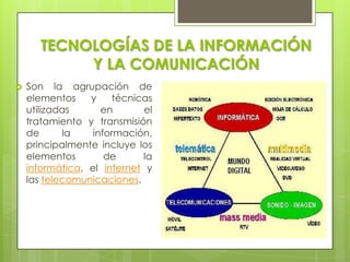 Las tecnologías de la información y la comunicación (TIC) incluyen elementos de informática, internet y telecomunicaciones que se usan para procesar y transmitir información. Surgieron con la invención del telégrafo y teléfono, y ahora incluyen internet, telefonía móvil y otras tecnologías. En el futuro probablemente habrá un aumento en sistemas portátiles, pantallas planas, tecnología inalámbrica y acceso generalizado a internet de banda ancha. Sin embargo, las TIC también plantean desafíos