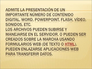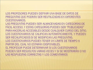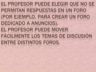 El documento describe varios módulos de una plataforma de aprendizaje en línea. El módulo de tareas permite a los profesores adjuntar comentarios a las tareas de los estudiantes y permitirles reenviar tareas calificadas. El módulo de consulta permite votaciones y encuestas para estudiantes. El módulo de foro muestra fotos de los autores y permite diferentes formatos de discusión, además de opciones de suscripción. El documento también menciona un módulo de cuestionario.
