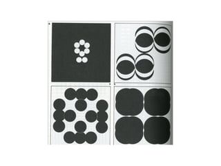 El documento describe las diferentes formas en que las formas geométricas pueden interactuar y organizarse, incluyendo la distancia, el toque, la superposición, la penetración y la unión. También describe conceptos como la repetición de formas, el cambio de proporción, dirección y posición, y la creación de estructuras a través de la reflexión, división y combinación de formas. Finalmente, explica conceptos como la similitud, sustracción, distorsión, unión y variaciones que pueden aplicarse a las formas.
