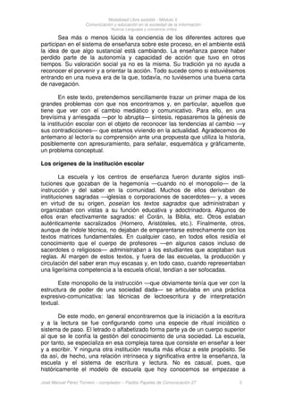Este documento discute cómo la sociedad de la información ha creado un nuevo escenario para la educación. Aunque las escuelas aún no han adoptado ampliamente las nuevas tecnologías, los estudiantes viven en un entorno cada vez más determinado por la tecnología fuera de la escuela. El autor traza los orígenes de la institución escolar para analizar cómo ha cambiado su papel y las presiones que enfrenta para adaptarse a la nueva era tecnológica.