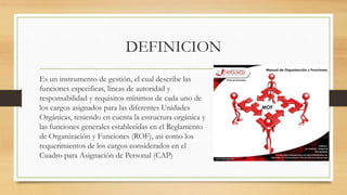 El documento presenta un manual de organización y funciones. Define un manual de organización y funciones como un instrumento de gestión que describe las funciones, líneas de autoridad y requisitos de cada cargo. Explica que el manual es importante porque proporciona información a los funcionarios sobre sus funciones y cómo se relacionan dentro de la estructura de la organización. Además, ayuda a institucionalizar la simplificación administrativa.