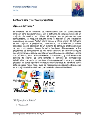 El documento habla sobre software libre y propietario. Explica que el software es un conjunto de instrucciones que permiten a las computadoras procesar datos. Luego discute las ventajas del software libre como el escrutinio público y la independencia del proveedor, y las desventajas del software propietario como la dificultad de modificarlo y la dependencia del fabricante. Finalmente, define software libre como aquel que otorga libertades de uso a los usuarios y software propietario como aquel que restringe estas libertades.