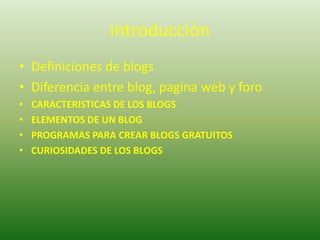 Este documento define un blog como un sitio web periódicamente actualizado que recopila cronológicamente textos o artículos. Explica las diferencias entre blogs, páginas web y foros, y destaca que los blogs permiten la publicación de contenido de forma sencilla y ágil. Además, describe las características principales de los blogs como comentarios, enlaces y multimedia, y los elementos clave para crear un blog como nombre, imagen, comentarios y estadísticas. Finalmente, menciona algunos programas gratuitos para crear blogs y curiosidades