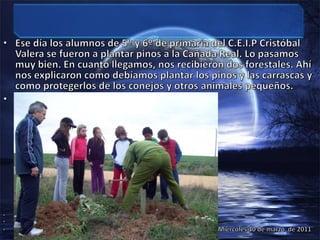 Los alumnos de 5o y 6o de primaria fueron a plantar pinos y encinas en la Cañada Real. Se dividieron en grupos para plantar los árboles y los forestales les explicaron cómo hacerlo correctamente. Después comieron y pasaron el tiempo libre explorando y jugando en los Pinares del Júcar.