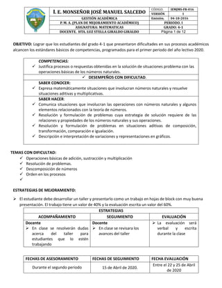 El documento presenta un plan de mejoramiento académico para estudiantes de matemáticas de grado 4-1, enfocado en resolver dificultades en operaciones básicas y en la formulación de problemas. Incluye objetivos de aprendizaje, estrategias de evaluación, así como actividades y ejercicios para mejorar competencias específicas. Se detalla un cronograma de actividades, incluyendo fechas de asesoramiento y evaluación.