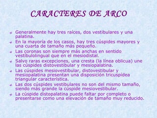 El documento describe las características morfológicas de los tres molares superiores desde diferentes ángulos. El primer molar superior tiene generalmente tres raíces y tres cúspides principales dispuestas en forma triangular. El segundo molar es más pequeño, con la cúspide distopalatina menos prominente e inclinación distal de las raíces. El tercer molar es el más pequeño, con raíces cortas y a menudo fusionadas e inclinación marcada.