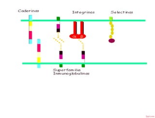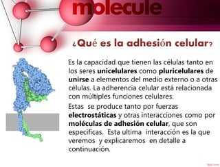 Las moléculas de adhesión celular (MACs) son glicoproteínas y moléculas de hidratos de carbono que se expresan en la superficie celular y permiten la adhesión entre células. Pertenecen a cinco familias principales: cadherinas, selectinas, inmunoglobulinas, integrinas y receptores de homing. Cumplen funciones importantes como el desarrollo de tejidos, migración celular e iniciación de respuestas inmunes. Algunos ejemplos clave son las E-cadherinas, las E