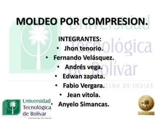 Este documento describe el proceso de moldeo por compresión. Resume que es un método de moldeo donde el material termoestable, generalmente precalentado, se coloca en un molde abierto que luego se cierra aplicando calor y presión para forzar al material a llenar la cavidad mientras se cura. Lista algunos materiales comunes como siliconas, poliéster y resinas epoxi, y ejemplos de piezas como discos, botones y manijas. Finalmente, destaca que las prensas verticales y moldes relativamente simples son los