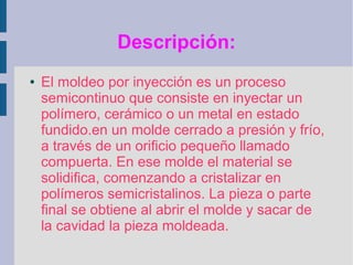 El proceso de moldeo por inyección implica inyectar un polímero, cerámico o metal fundido en un molde cerrado a presión. El material se solidifica dentro del molde y luego la pieza moldeada se extrae cuando se abre el molde. El ciclo de moldeo por inyección consiste en 6 pasos: 1) cerrar el molde vacío, 2) inyectar el material fundido, 3) mantener la presión, 4) eliminar la presión, 5) enfriar y abrir el molde, y 6) cerrar el molde