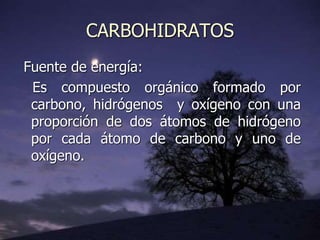Este documento describe las principales moléculas biológicas que forman la vida: carbohidratos, lípidos, proteínas y ácidos nucleicos. Los carbohidratos incluyen monosacáridos como la glucosa y la fructosa, disacáridos como la sacarosa y polisacáridos como el almidón. Los lípidos se dividen en triglicéridos, fosfolípidos y esteroides. Las proteínas están formadas por aminoácidos y pueden ser simples o conjugadas, globulares o fibrosas. Los