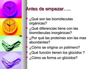 Las biomoléculas orgánicas incluyen glúcidos, lípidos, proteínas y ácidos nucleicos. Los glúcidos incluyen monosacáridos como la glucosa y la fructosa que se unen para formar polímeros como el almidón y la celulosa. Los lípidos incluyen grasas y aceites que se componen principalmente de carbono e hidrógeno. Las proteínas están formadas por cadenas de aminoácidos unidos. Los ácidos nucleicos ADN y ARN almacenan y expresan la información gen