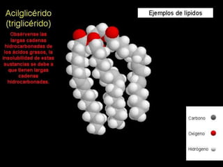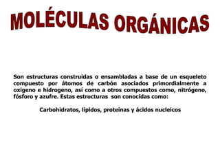 Las biomoléculas principales son carbohidratos, lípidos, proteínas y ácidos nucleicos. Estas moléculas se agrupan entre sí o con otras para formar estructuras supramoleculares que cumplen funciones esenciales como almacenamiento de energía, estructurales, enzimáticas y de transporte. Los carbohidratos, lípidos y proteínas proporcionan energía a las células, mientras que los ácidos nucleicos almacenan y transmiten la información genética.