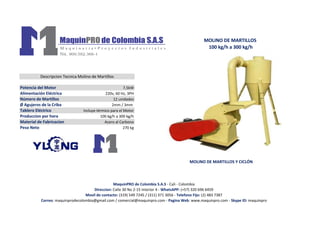 El documento describe las especificaciones técnicas de un molino de martillos, incluyendo una potencia de motor de 7.5 kW, alimentación eléctrica de 220v 60 Hz 3PH, 12 martillos, una producción de 100 a 300 kg/h, fabricado en acero al carbono y un peso neto de 270 kg. Proporciona también detalles de contacto para la compañía que lo fabrica.