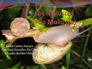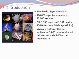El documento proporciona información sobre la diversidad de moluscos. Los moluscos constituyen el segundo filo más diverso, con más de 100,000 especies vivas. En Puerto Rico hay aproximadamente 1,350 especies de moluscos, la mayoría marinas. Los moluscos se utilizan como alimento y tienen usos culturales entre los grupos indígenas. Los principales grupos de moluscos son los quitones, colmillos de mar, cefalópodos, bivalvos y gasterópodos. Cada grupo tiene características distintivas y diversas