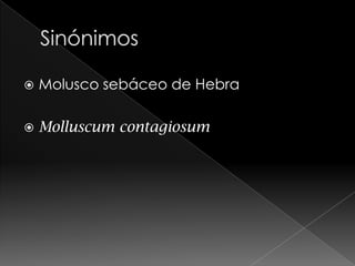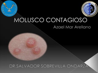 Este documento describe el molluscum contagiosum, una dermatosis benigna causada por el virus del mollusco contagioso. Se caracteriza por neoformaciones esféricas de 2-3 mm en la piel que pueden ser umbilicadas y contener liquido grumoso. Afecta principalmente a niños y adultos sexualmente activos, y se transmite por contacto directo.