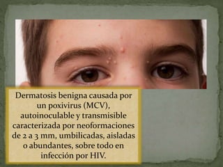 Este documento describe el molluscum contagiosum, una infección de la piel causada por un poxvirus. Afecta principalmente a niños entre 10-12 años y adultos sexualmente activos. Se caracteriza por pequeñas protuberancias en la piel que contienen el virus. Su tratamiento incluye métodos como criocirugía, aplicación de ácido tricloroacético o imiquimod.