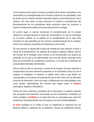 El documento resume las cinco unidades básicas de la ecología: 1) cadenas tróficas y flujo de energía, 2) ciclos de elementos, 3) hábitats y nichos ecológicos, 4) ecosistemas como unidades funcionales de vida, y 5) leyes de la ecología según Barry Commoner. Explica que la ecología estudia las interrelaciones entre organismos y su ambiente, lo que es fundamental para comprender problemas ambientales causados por la alteración de ciclos biogeoquímicos.