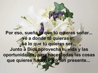 El documento habla sobre la importancia de aprovechar la vida y las oportunidades junto a Dios, recordando que la felicidad llega a quienes han sufrido y buscado, ya que solo ellos pueden apreciar a quienes han dejado huella. También menciona que el amor nace con una sonrisa pero termina con una lágrima, y que para tener éxito en la vida hay que dejar atrás los fracasos y penas del pasado.