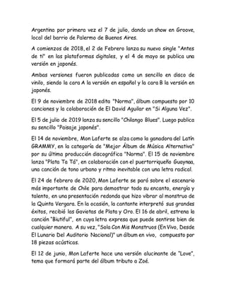 Mon Laferte es una cantautora chilena que alcanzó éxito en América Latina. En 2009 se diagnosticó con cáncer de tiroides y cambió su nombre artístico a "Mon Laferte". Ha lanzado nueve álbumes de estudio desde 2011, recibiendo múltiples nominaciones a los Grammy Latinos y Discos de Oro y Platino. Además de cantar, Mon Laferte también se ha dedicado a la pintura, exhibiendo sus obras de arte en París en enero de 2022.