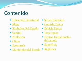El documento resume información sobre el estado Monagas en Venezuela. Incluye detalles sobre su ubicación, superficie, capital, municipios, población, clima, economía y sitios turísticos. También describe las comidas típicas, bebidas, trajes, y fiestas tradicionales de la región.