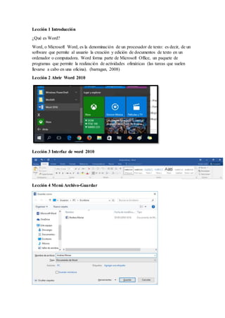Este documento presenta 42 lecciones sobre el uso del software de procesamiento de texto Microsoft Word. Las lecciones cubren temas como abrir y guardar archivos en Word, usar la interfaz y barra de herramientas, aplicar formato de texto como fuente, color y estilo, insertar tablas, imágenes, gráficos y SmartArt, y realizar operaciones básicas como copiar, cortar y pegar. El objetivo general es enseñar las funciones y herramientas básicas de Word.