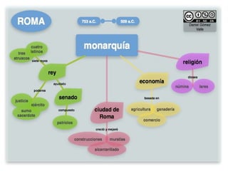 La historia romana temprana se divide en tres etapas: la Monarquía (753-509 aC), cuando Roma estaba limitada al centro de Italia y gobernada por un rey asesorado por el Senado y la Asamblea; la República (509-27 aC), cuando el último rey Tarquino el Soberbio fue expulsado y el poder pasó a los cónsules y el Senado; y el Imperio (27 aC-476 dC), cuando Augusto estableció un gobierno imperial autoritario.