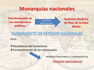 Las monarquías nacionales surgieron a fines de la Edad Media debido al debilitamiento del poder imperial y la consolidación de la idea de nación. Para afianzarse, las monarquías debieron lograr la unidad territorial, desarrollar una burocracia centralizada y obtener el apoyo de la burguesía para enfrentar a la aristocracia feudal. Francia, Inglaterra y España lograron estos objetivos de distintas formas, mientras que Alemania e Italia se dividieron en múltiples principados.