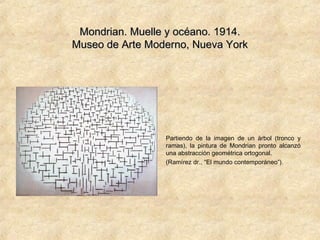 Piet Mondrian fue una figura clave en el movimiento abstracto internacional de los años 1930. Su trabajo evolucionó de imágenes naturalistas a abstracciones geométricas compuestas solo por líneas verticales y horizontales y los colores primarios. Mondrian se mudó a Londres en 1938 para escapar de la ocupación nazi y luego a Nueva York en 1940, donde se inspiró en la arquitectura de la ciudad y el jazz, creando obras como "Broadway Boogie Woogie".