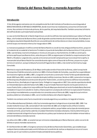 El documento describe la historia del Banco de la Nación Argentina y la evolución de la moneda argentina. Explica que el edificio del banco actualmente se ubica en el mismo sitio que antiguamente ocupó el primer Teatro Colón de Buenos Aires, construido en 1857. En 1937, el arquitecto Alejandro Bustillo comenzó la construcción del edificio actual sobre las bases del teatro original, un proyecto que llevó 18 años completar. También resume los orígenes y cambios de la moneda argentina desde su unificación en 1881 bajo el
