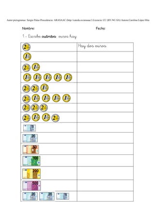 El documento presenta una hoja de trabajo con tres preguntas sobre cantidades de dinero. La primera pregunta es "Escribe cuántos euros hay" y debajo hay dos euros dibujados. La segunda pregunta es "Escribe cuántos céntimos hay" y debajo hay un céntimo dibujado. La tercera pregunta es "Escribe la cantidad total" para sumar los euros y céntimos anteriores.