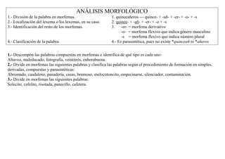 El documento explica los diferentes tipos de morfemas (léxicos, gramaticales) y cómo se combinan para formar palabras simples, derivadas, compuestas y parasintéticas. Define prefijos, sufijos e infijos como morfemas derivativos y flexivos como morfemas gramaticales que indican género, número, persona, tiempo, modo y aspecto. Finalmente, describe el análisis morfológico de las palabras dividiéndolas en morfemas y clasificándolas según su tipo de formación.