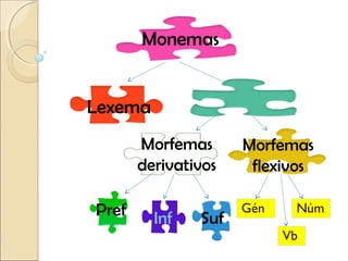 El documento describe los componentes de las palabras, como monemas, lexemas y morfemas, clasificándolos en morfemas derivativos y flexivos. Se señala la formación de palabras simples, derivadas, compuestas y parasintéticas, indicando las características de cada tipo. Se enfatiza la importancia de los morfemas en el significado léxico y gramatical de las palabras.