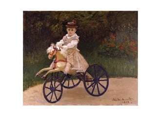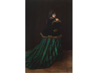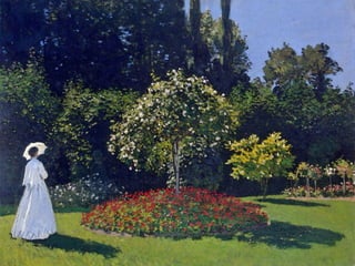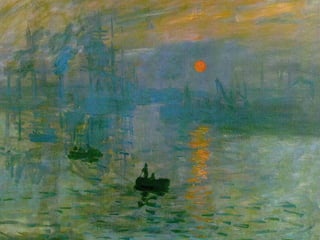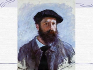 Este documento presenta información sobre el pintor impresionista Claude Monet. Nació en 1840 en París y desde joven le gustaba dibujar paisajes y caricaturas para ganar dinero. Más tarde conoció a otros artistas con los que fundó el movimiento impresionista, enfocándose en capturar impresiones visuales usando colores y pinceladas sueltas. En 1874 tuvieron su primera exhibición oficial en París, donde se les llamó "Impresionistas". Monet fue uno de los pintores impresionistas más importantes y creía en pint