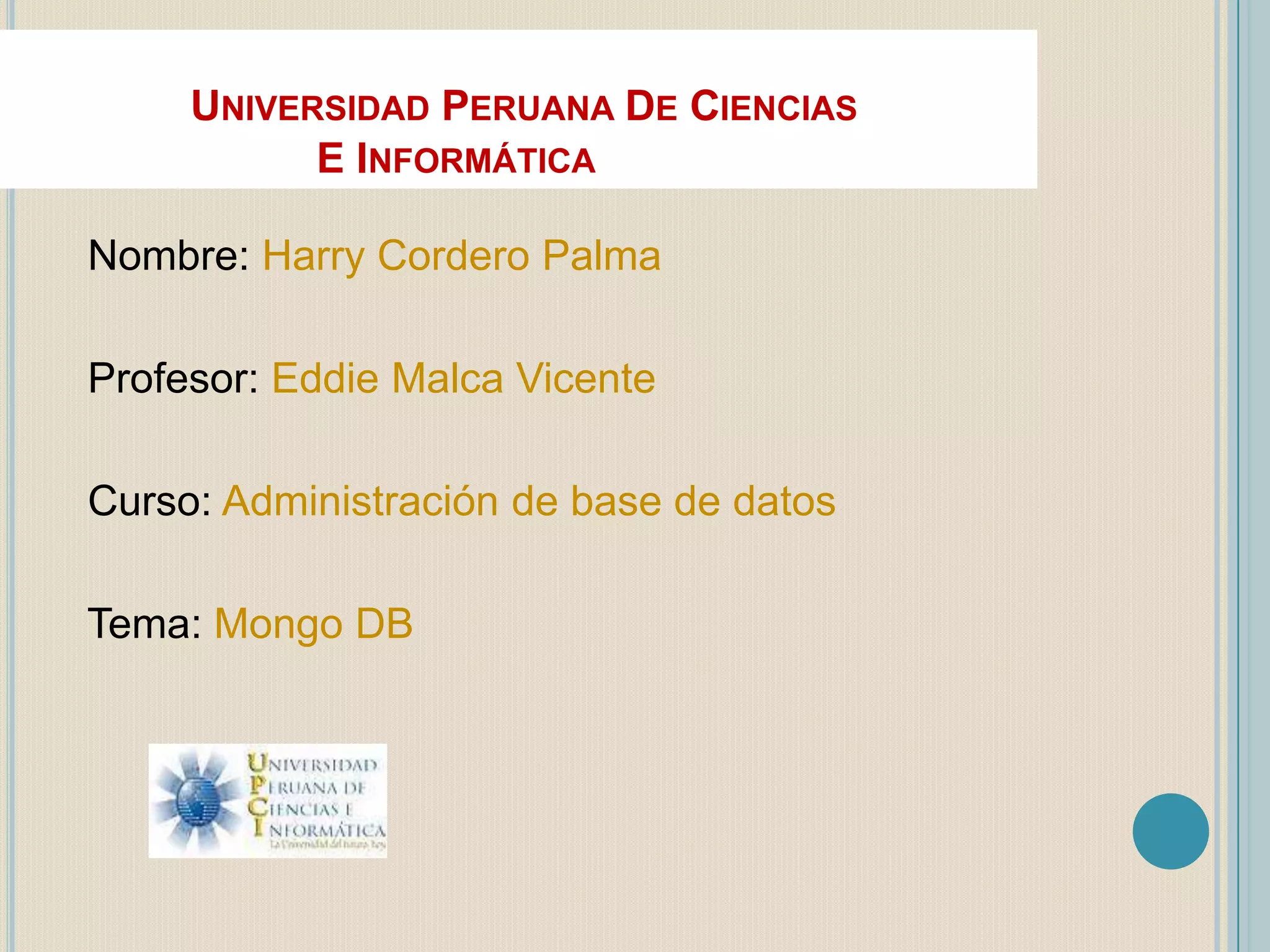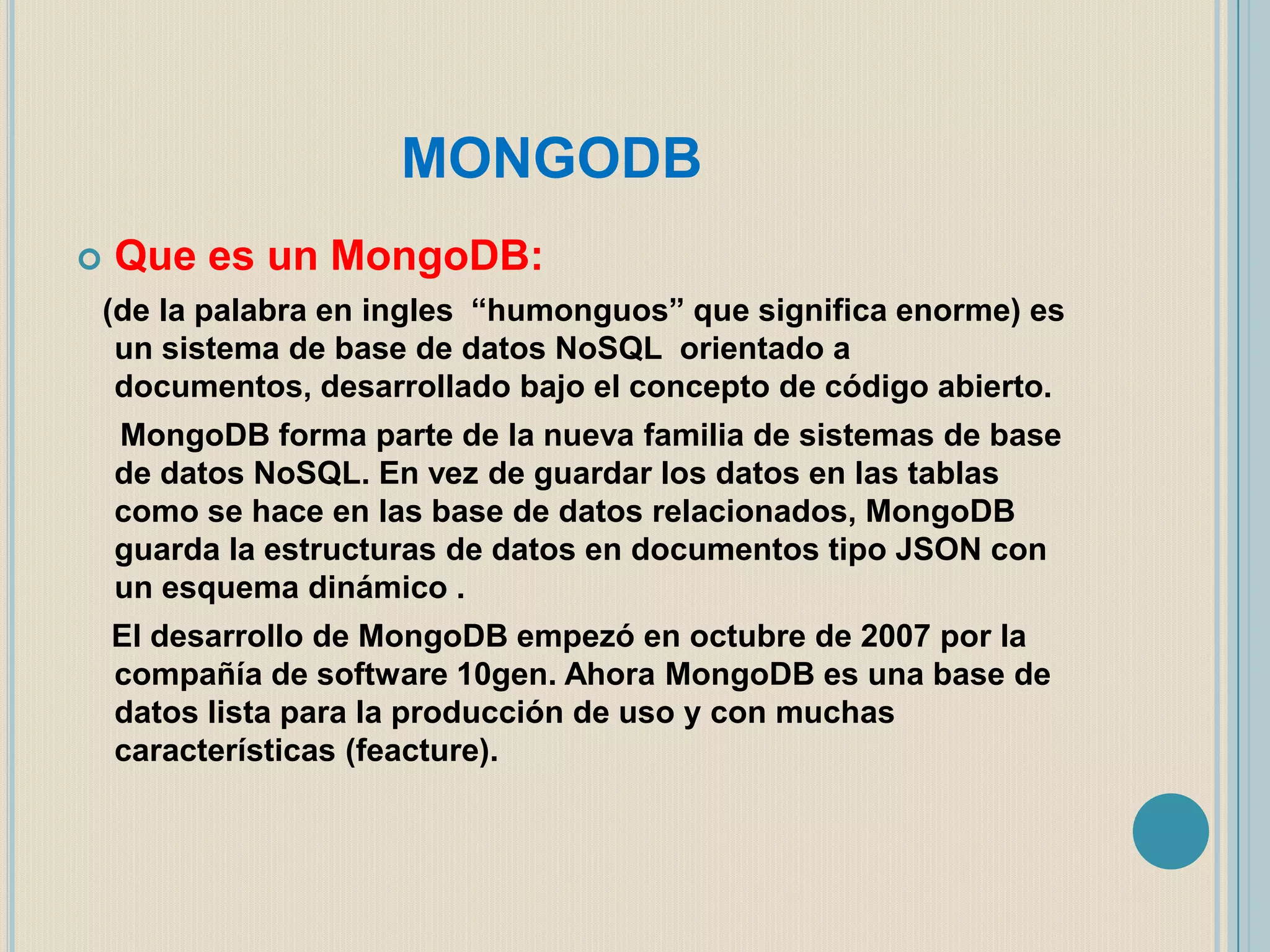 MongoDB es una base de datos NoSQL orientada a documentos desarrollada bajo el concepto de código abierto. Almacena datos en documentos similares a JSON con un esquema dinámico en colecciones, en lugar de tablas como las bases de datos relacionales. Ofrece características como consultas, balanceo de carga horizontal, y drivers para varios lenguajes de programación. Se usa comúnmente para registro de eventos, contenido, comercio electrónico, y otras aplicaciones con altos volúmenes de lectura.