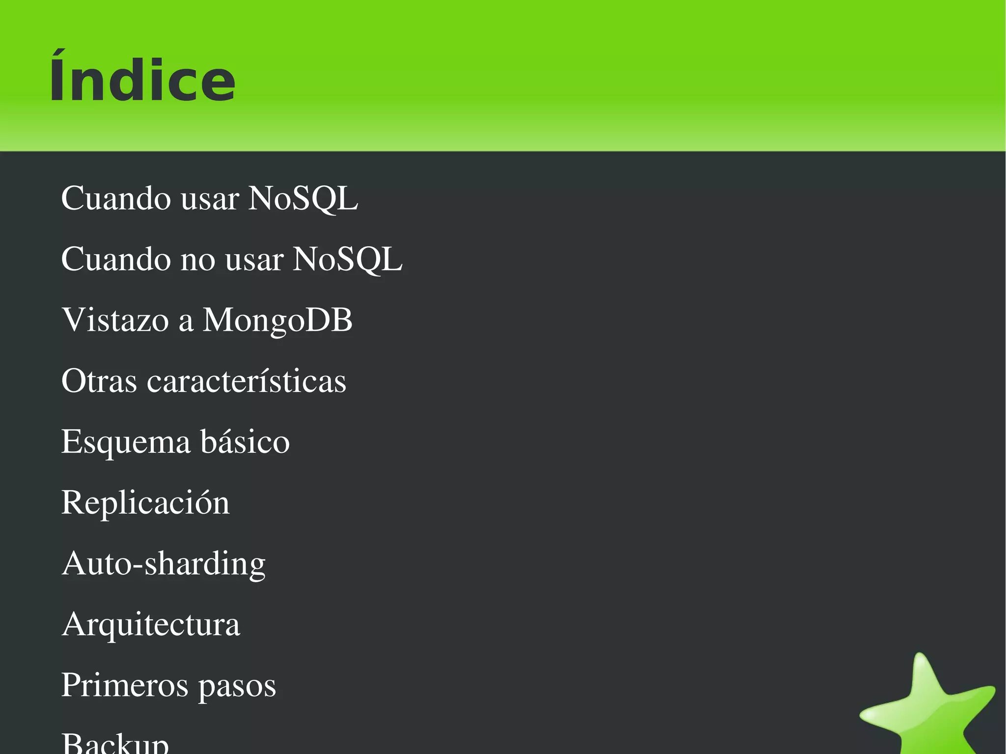 Este documento introduce MongoDB, una base de datos NoSQL orientada a documentos. Explica cuando usar MongoDB, como cuando se necesita escalabilidad horizontal, alto volumen de datos o cacheo. También describe características como replicación automática, sharding y esquema flexible de documentos. Finalmente, ofrece una guía básica sobre cómo configurar shards, colecciones y réplicas en MongoDB.