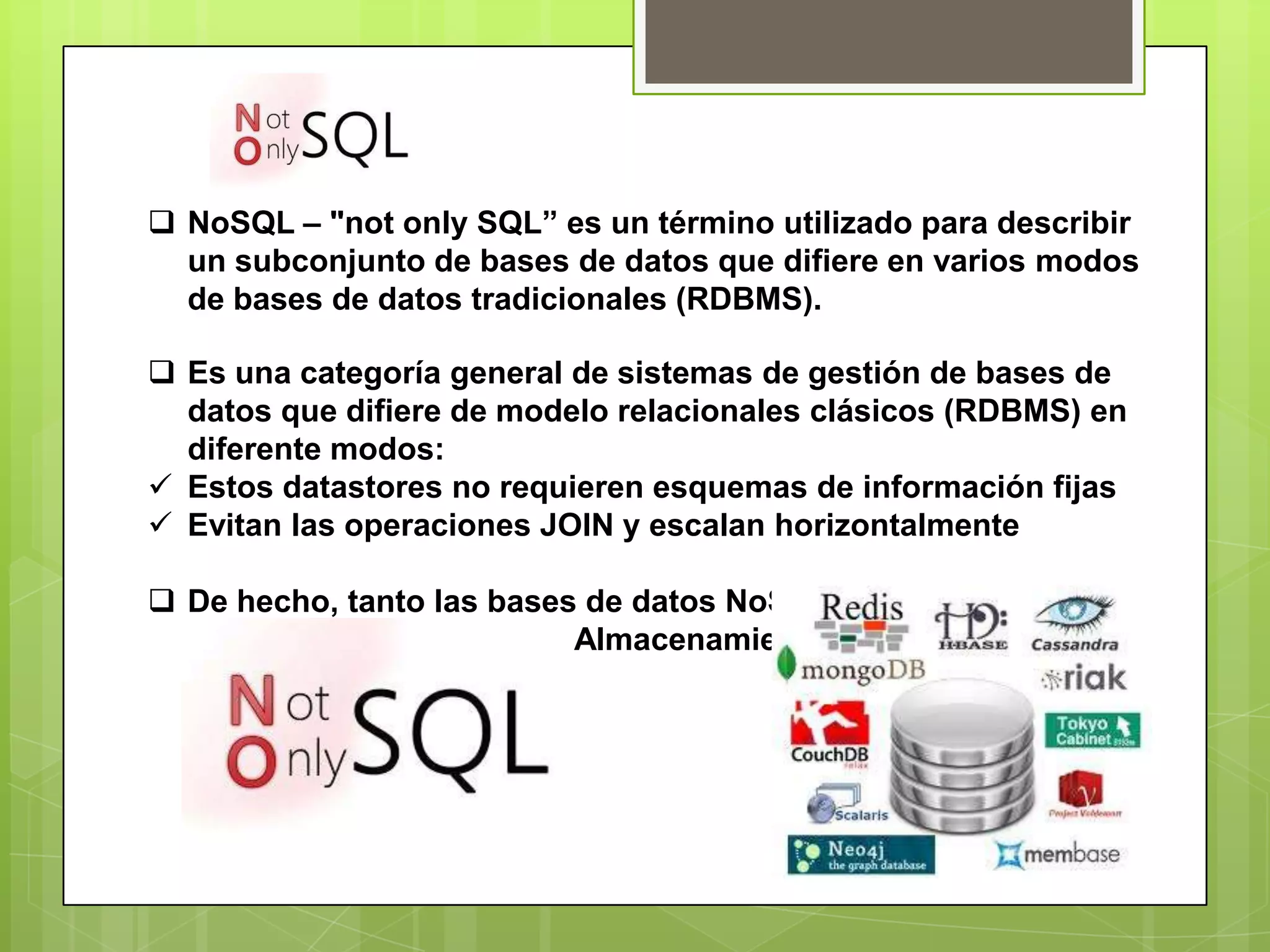 El documento describe MongoDB, una base de datos NoSQL orientada a documentos. MongoDB almacena datos en formato BSON y permite esquemas dinámicos. Ofrece características como consultas ad-hoc, indexación, replicación, balanceo de carga y ejecución de JavaScript en el servidor.