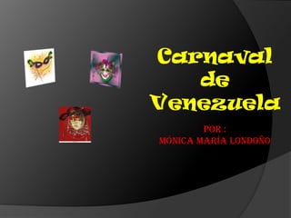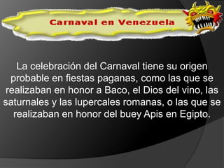 El documento describe las tradiciones del Carnaval en Venezuela, incluyendo sus orígenes paganos. Explica que el Carnaval en Caracas ya no existe debido a la delincuencia, pero se celebra en otros pueblos como Carúpano, El Callao, Maturín y Cumaná. Destaca que el Carnaval más famoso es el de El Callao, donde grandes comparsas de 300 personas o más desfilan con música y vestimentas tradicionales como las madamas y los diablos.