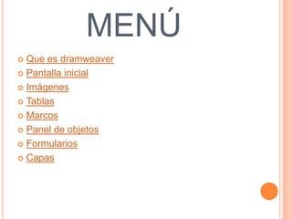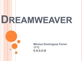 Este documento proporciona una introducción a Adobe Dreamweaver, incluyendo una descripción general, una explicación de sus principales funciones como la inserción de imágenes, tablas, marcos, formularios y capas, y breves instrucciones sobre cómo utilizar estas herramientas.