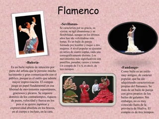 El documento describe varios bailes tradicionales como el flamenco, bailes latinos como la salsa, y bailes más modernos. Explica los orígenes, características y estilos de bailes como la bulería, el fandango, las sevillanas, el cha-cha-chá, el pasodoble, la samba, el tango, el merengue, y la salsa. También habla sobre bailes de salón, el claqué, la danza lírica, el hip hop, el funky y el baile moderno.
