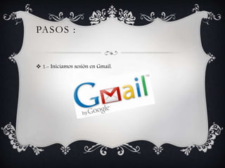 Este documento proporciona 5 pasos para crear un blog en Blogger a través de Gmail: 1) iniciar sesión en Gmail, 2) hacer clic en la opción de crear Blogger, 3) una vez creado el blog, hacer clic en la opción de crear blog, 4) se abrirá un cuadro de texto para ingresar el título, dirección y plantilla, y 5) el blog será creado una vez completado este proceso.