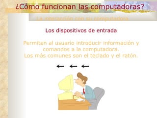 El documento describe los principales dispositivos de entrada, salida y comunicación de una computadora. Explica que los dispositivos de entrada como el teclado y ratón permiten introducir información, mientras que los dispositivos de salida como el monitor e impresora permiten ver los resultados. Describe los diferentes tipos de monitores CRT y LCD, e impresoras de inyección de tinta y láser.