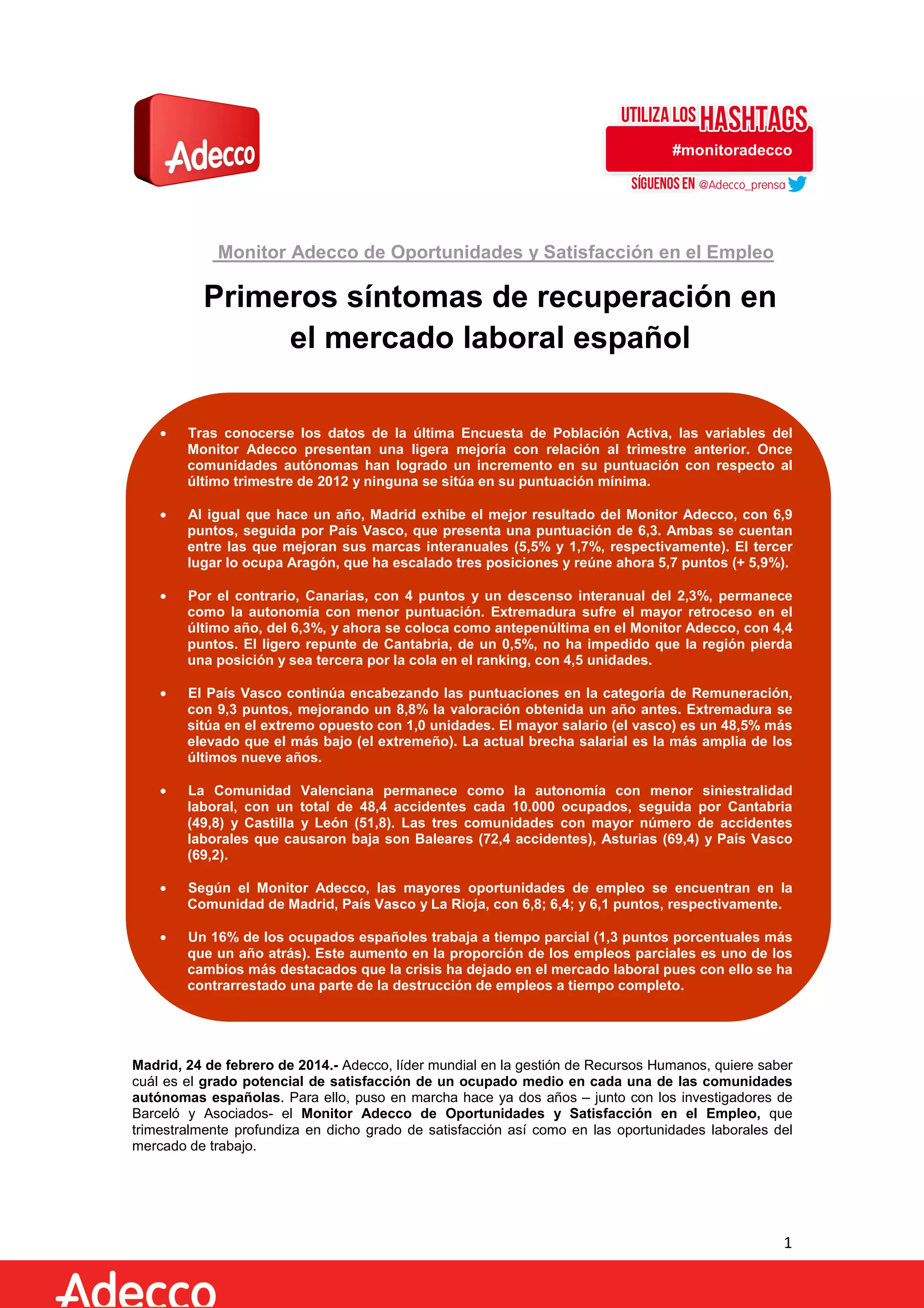 El documento presenta los resultados del Monitor Adecco de Oportunidades y Satisfacción en el Empleo para el cuarto trimestre de 2013. Madrid obtuvo la puntuación más alta con 6,9 puntos, seguida de País Vasco con 6,3 puntos. Once comunidades autónomas mejoraron sus puntajes con respecto al trimestre anterior, lo que sugiere una ligera recuperación del mercado laboral español. Canarias obtuvo la puntuación más baja con 4 puntos. El documento analiza las puntuaciones de cada comunidad autónoma
