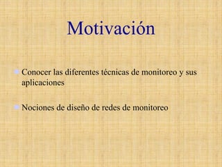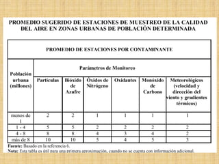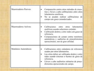 Este documento describe diferentes técnicas de monitoreo de la calidad del aire, incluyendo muestreadores pasivos, muestreadores activos, monitores automáticos y monitores remotos. Los muestreadores pasivos son simples y de bajo costo pero tienen una resolución temporal limitada, mientras que los muestreadores activos y monitores automáticos pueden medir concentraciones de contaminantes de forma continua pero son más costosos. Los monitores remotos pueden mapear distribuciones tridimensionales de contaminantes pero tienen aplicaciones especializ