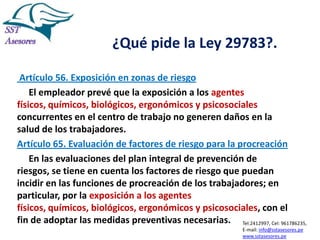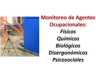 El documento outlinea la normativa sobre el monitoreo de agentes ocupacionales, que incluyen físicos, químicos, biológicos, ergonómicos y psicosociales, según la ley 29783. Se enfatiza la responsabilidad del empleador de garantizar que la exposición a estos agentes no cause daños a la salud de los trabajadores, así como la importancia de realizar evaluaciones para prevenir riesgos de procreación. Además, se describen los métodos, equipos y criterios de evaluación necesarios para llevar a cabo estos monitoreos de manera efectiva.
